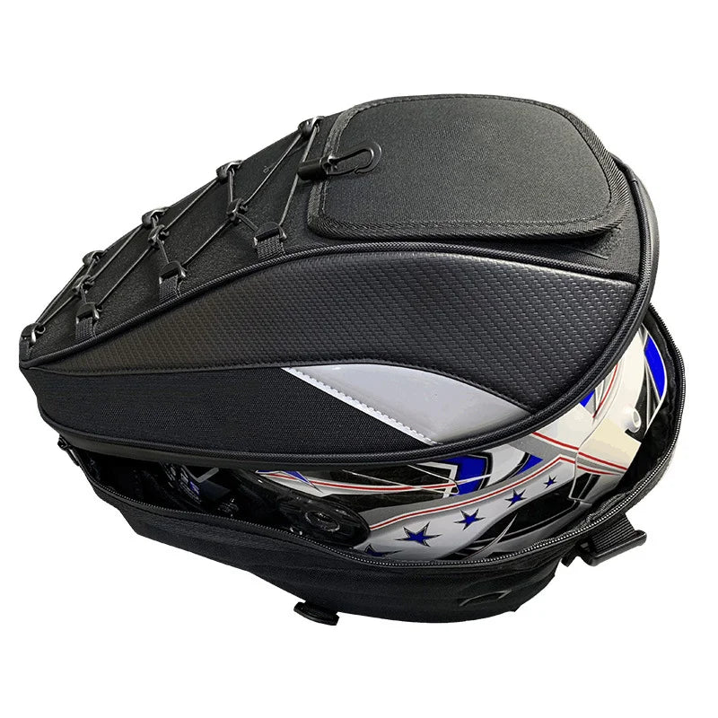 Projetada para motociclistas, esta mochila combina proteção, praticidade e estilo. Feita em tecido Oxford impermeável com acabamento em fibra de carbono, oferece alta resistência à água e ao desgaste. O design é compacto e aerodinâmico, ideal para viagens, uso urbano ou trilhas curtas.